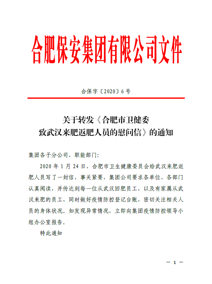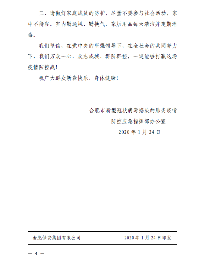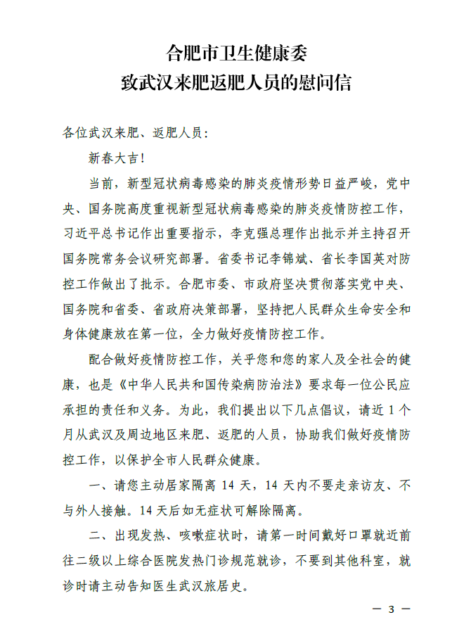 合肥市衛(wèi)生健康委致武漢來肥返肥人員的慰問信