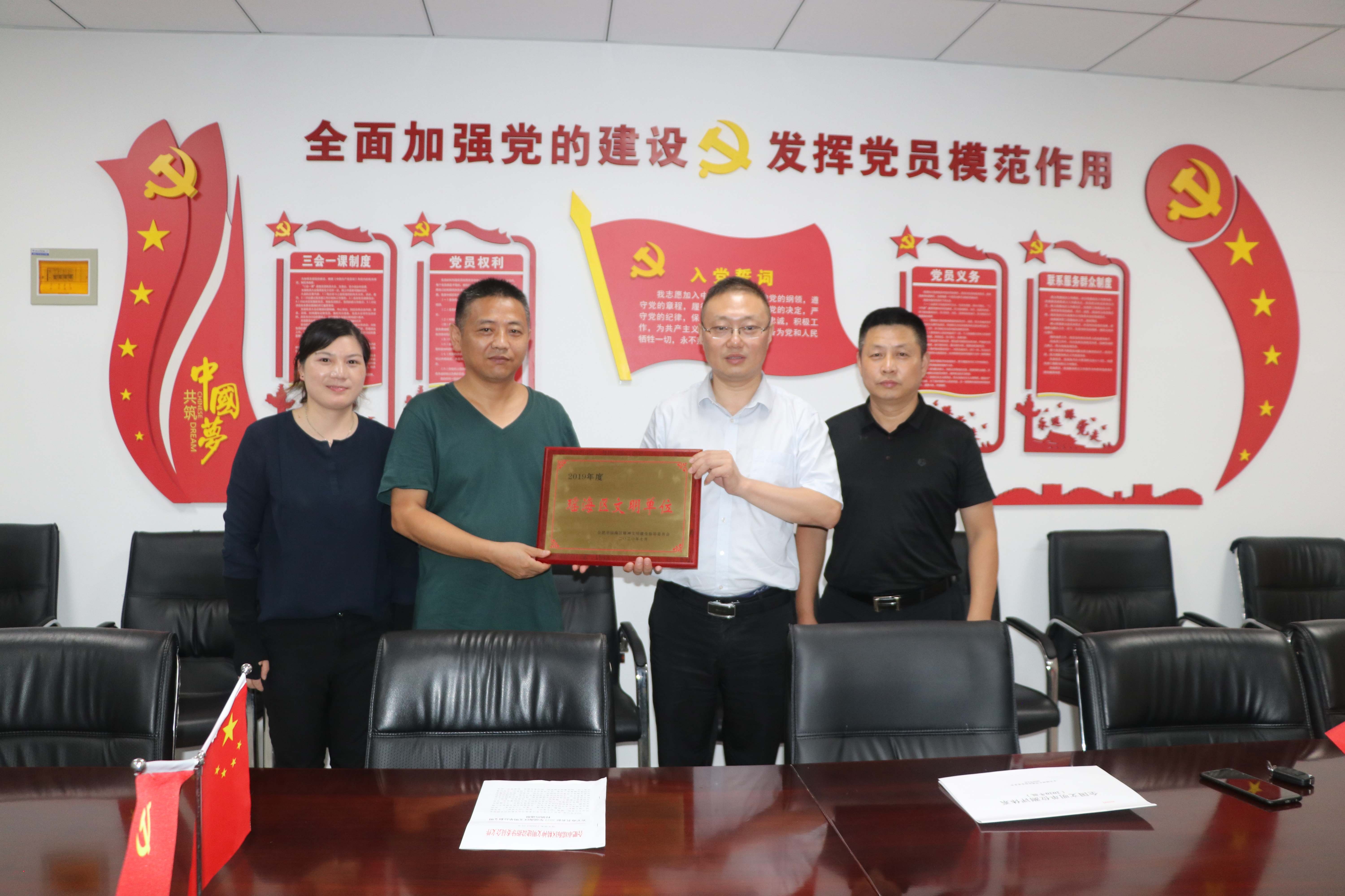 8月6日下午,合肥市瑤海區(qū)嘉山路街道三角線社區(qū)黨委書記劉軍、副書記徐李麗一行來到合肥保安集團(tuán)押運(yùn)分公司三角線基地,專程為押運(yùn)分公司頒發(fā)“2019年度瑤海區(qū)文明單位”獎(jiǎng)牌。