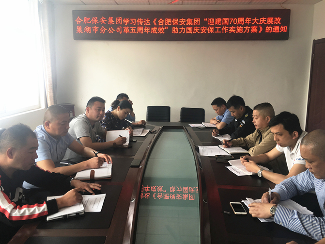 為積極響應集團公司號召,從形象上、素質上、管理上全面提高規(guī)范化水平,5月20日,巢湖市分公司召開專題會議,傳達學習《合肥保安集團“迎建國70周年大慶展改制五周年成效”助力國慶安保工作實施方案》的通知精神,號召分公司全體員工積極投身服務70周年國慶安保工作。